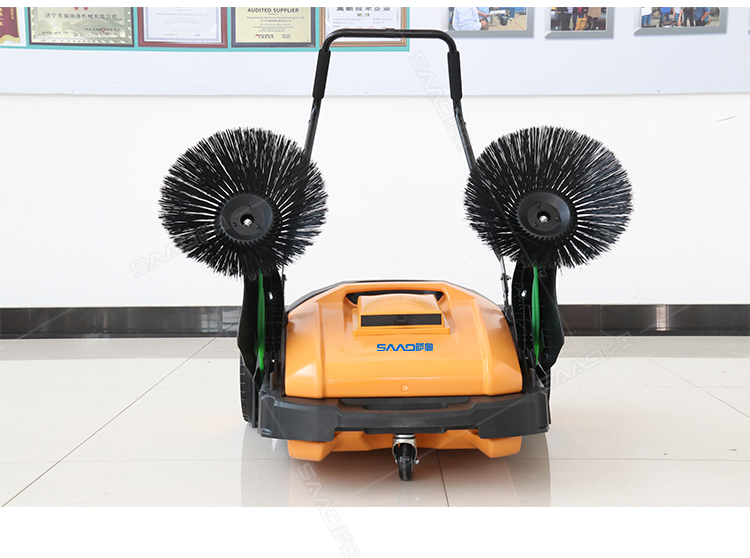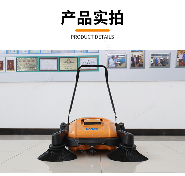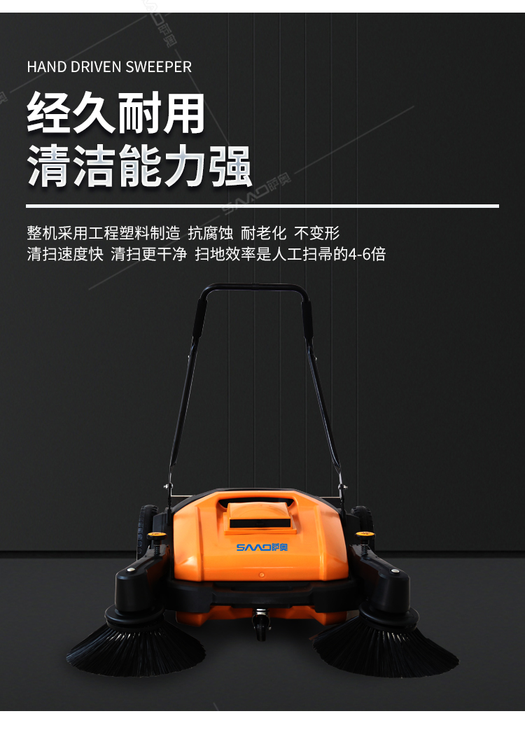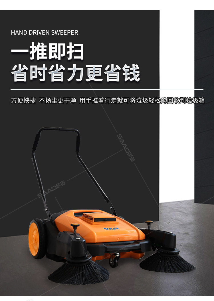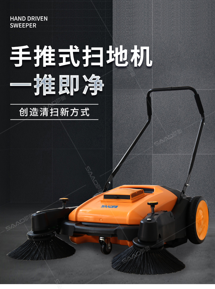 手推式掃地機能清潔房屋周邊范圍:包括小路,公路,車道和院子,能比用普通的掃把和簸箕節省5倍的時間,清掃時垃圾被迅速的收集到塵箱,簡單、快速、干凈。