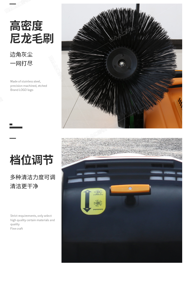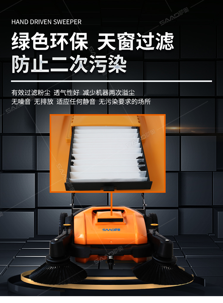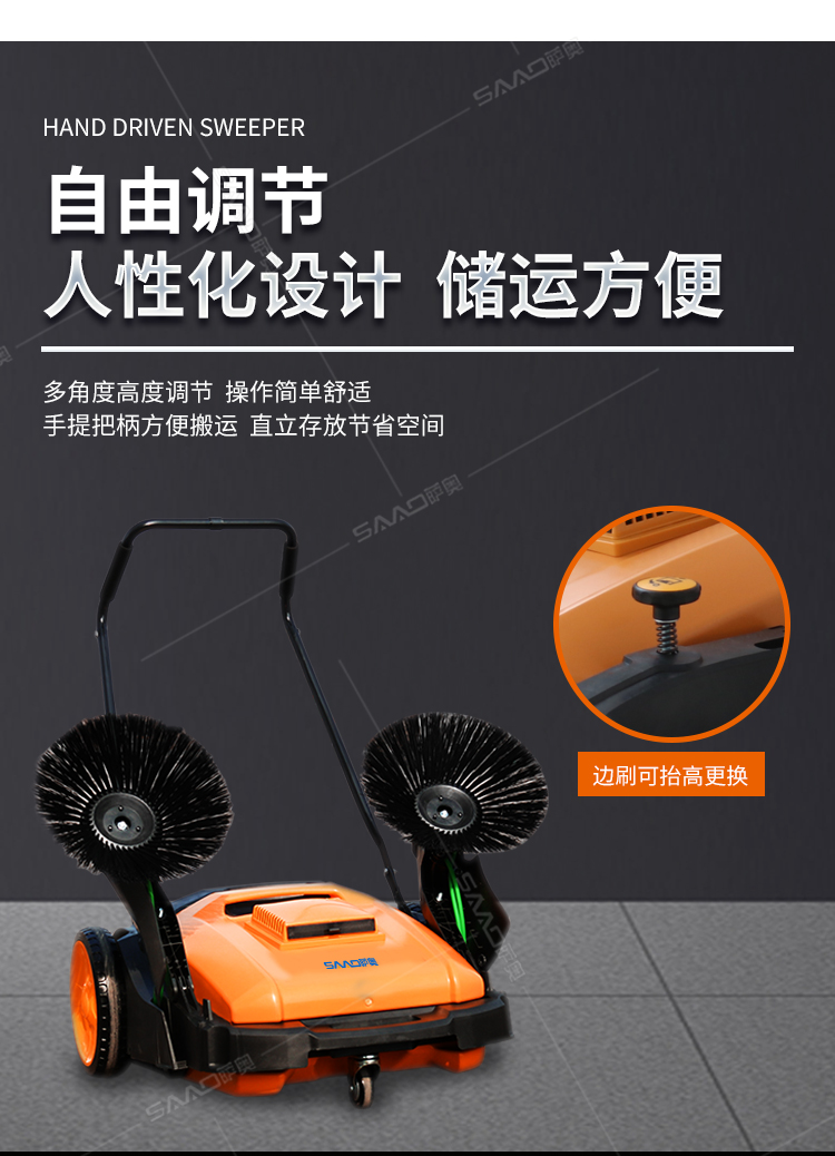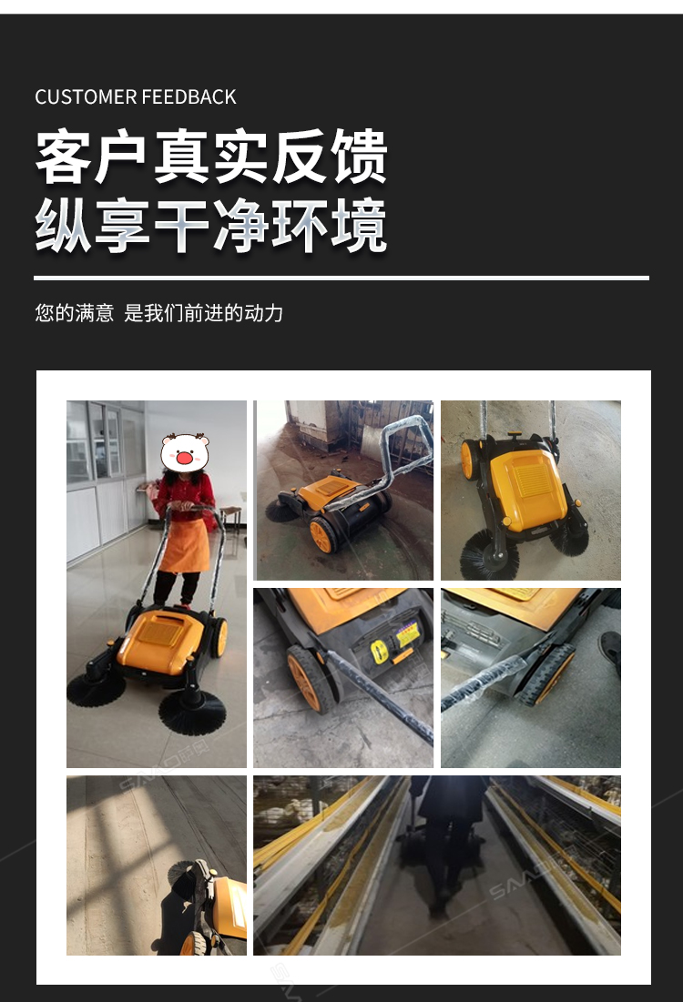 手推式掃地機能清潔房屋周邊范圍:包括小路,公路,車道和院子,能比用普通的掃把和簸箕節省5倍的時間,清掃時垃圾被迅速的收集到塵箱,簡單、快速、干凈。