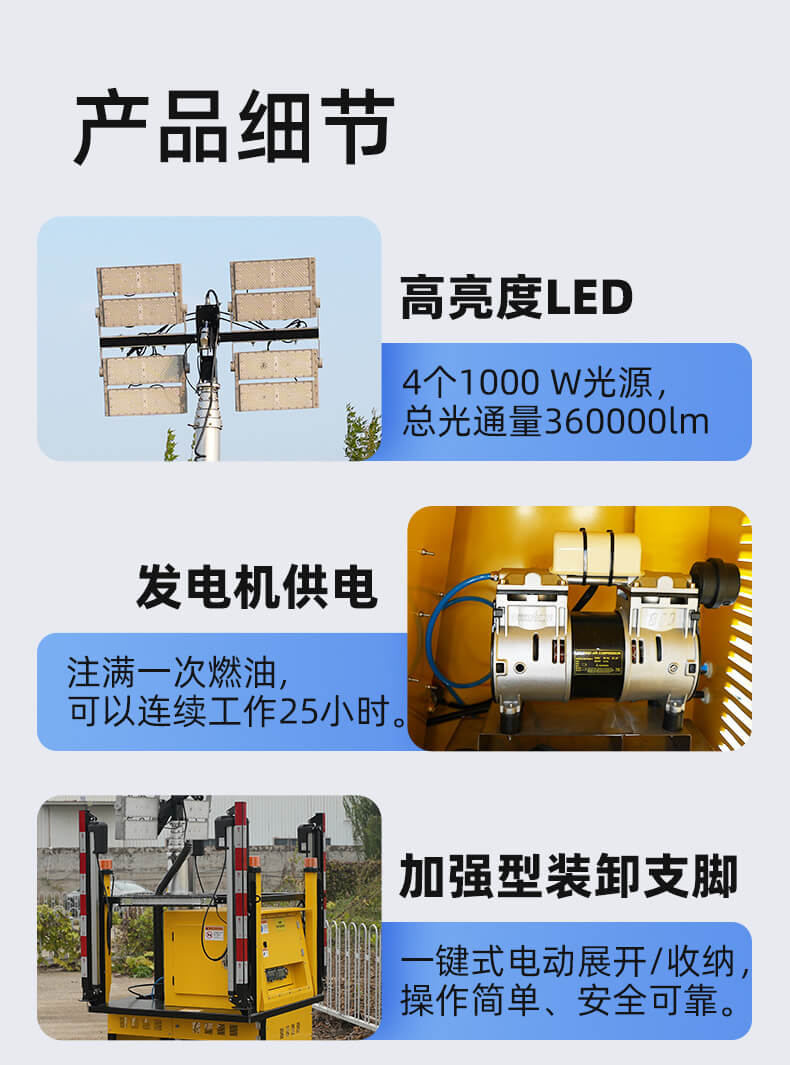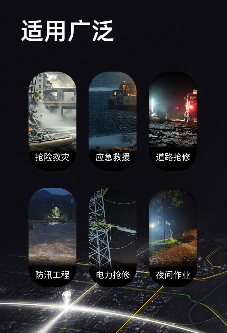 適用于維護搶修、事故處理、防汛抗洪、搶險救災等大面積照明。