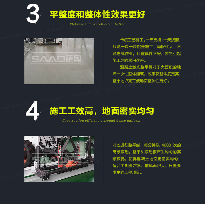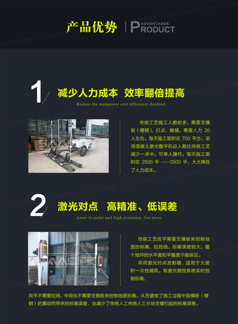 手扶激光整平機的性能優勢: 1,傳統的地坪施工多采用人工支模,振動棒振搗整平,人工操作的地坪常有密實度不均勻,平整度差以及作業效率低等缺點; 2,本產品的激光控制系統通