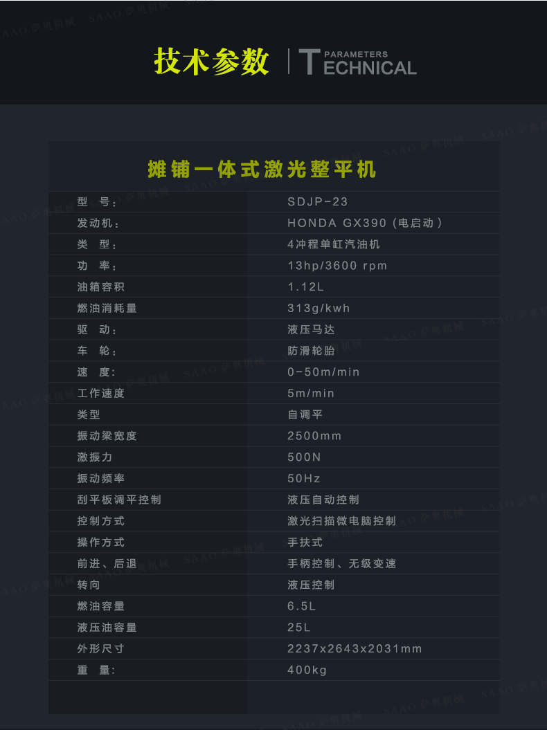 我廠專業生產制造激光整平攤鋪機,品質保證,全國發貨。有座駕式6輪激光整平機,座駕式4輪激光整平機,手扶式激光整平機,小型激光整平機,規格齊全,如需了解請致電24小時免費電話:400-860-5689