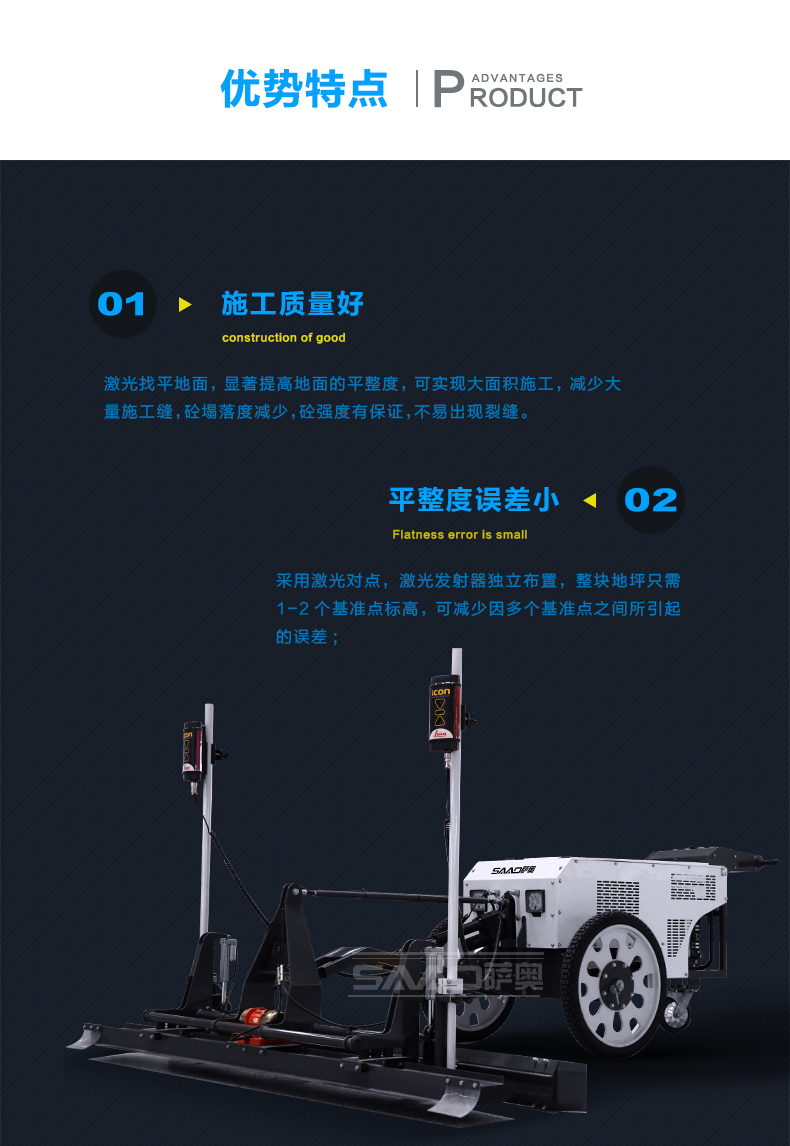1.激光整平機的找平原理是,利用精密激光技術、閉環控制技術和高度精密的液壓系統,在電腦的自動控制下實現的,這是它有別于其它地坪施工工藝的突出的特點。