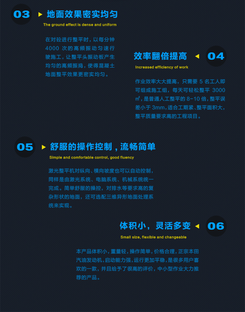 2.精密激光整平機的整平原理是,依靠液力驅動的整平頭,配合激光系統和電腦控制系統在自動找平的同時完成整平工作。整平頭上配備有一體化設計的刮板、振動器和整平板,將所有找平、整平、振搗壓實工作集于一身,并一次性完成。電腦控制系統每秒10次實時自動調整標高,均衡設計的振動器振動頻率達4000次/分鐘。