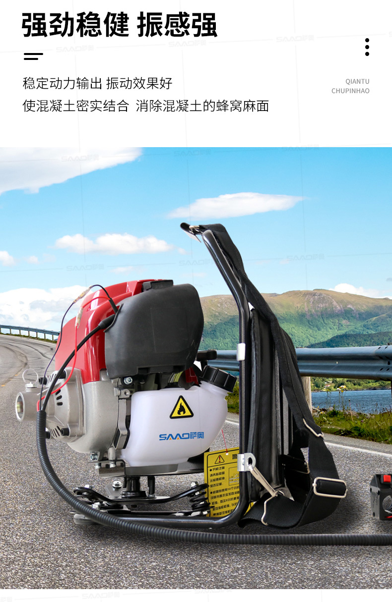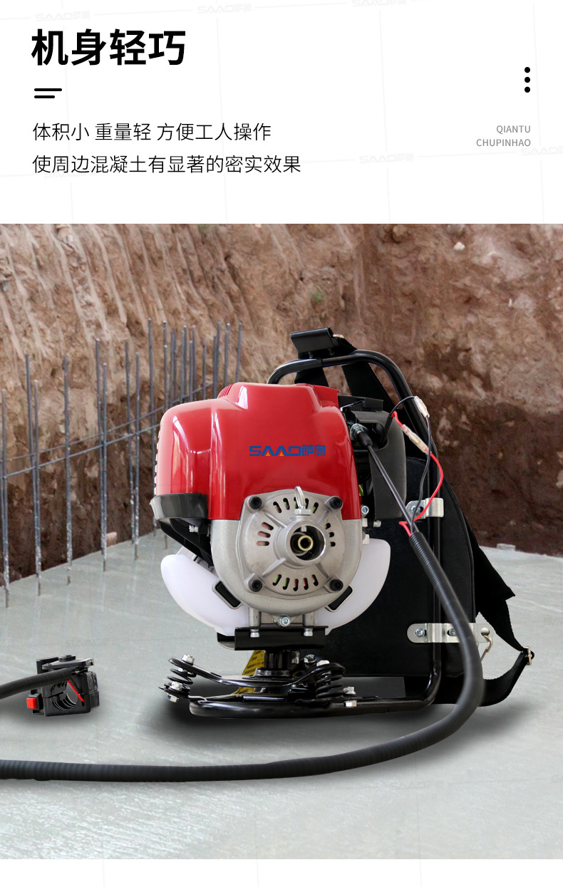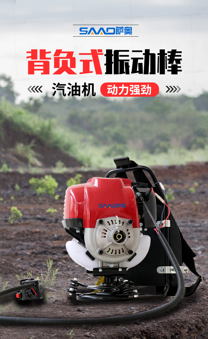 薩奧牌混凝土背負式汽油機振動棒是采用優質汽油機為動力直接驅動,是廣泛適用于道路、橋梁、隧道、樓層基礎和各種混凝土梁、柱及預制構件現場澆注施工的重要工具,是偏遠無電