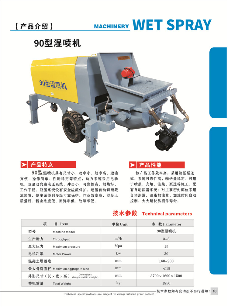 這款混凝土濕噴機主要用于混凝土的噴濕,可用于噴漿、充填、注漿、泵送等工程施工。能使混合料拌合均勻,水灰比準確控制,有利于水泥的水化,因而粉塵小,回彈小、混凝土均質性好,強度高。結構合理、性能穩定、操作維護方便、使用壽命長,應用于鐵(公)路,地鐵,高層建筑,護坡(基坑)加固,水電工程,地下工程及礦山井巷噴射混凝土施工作業。