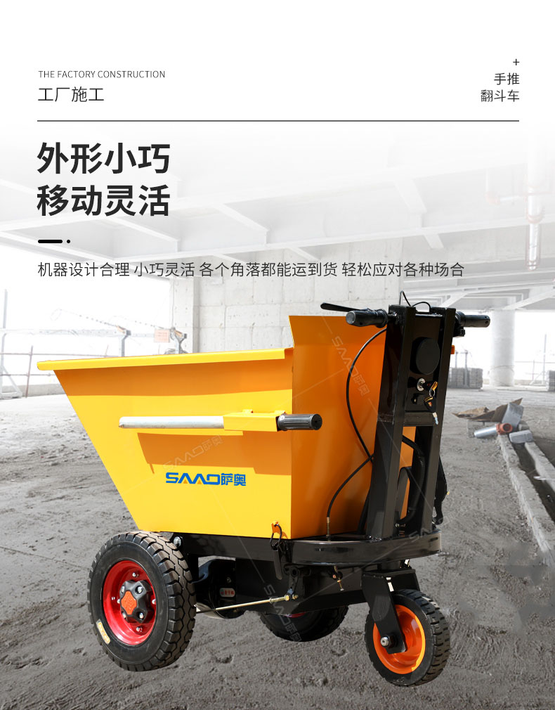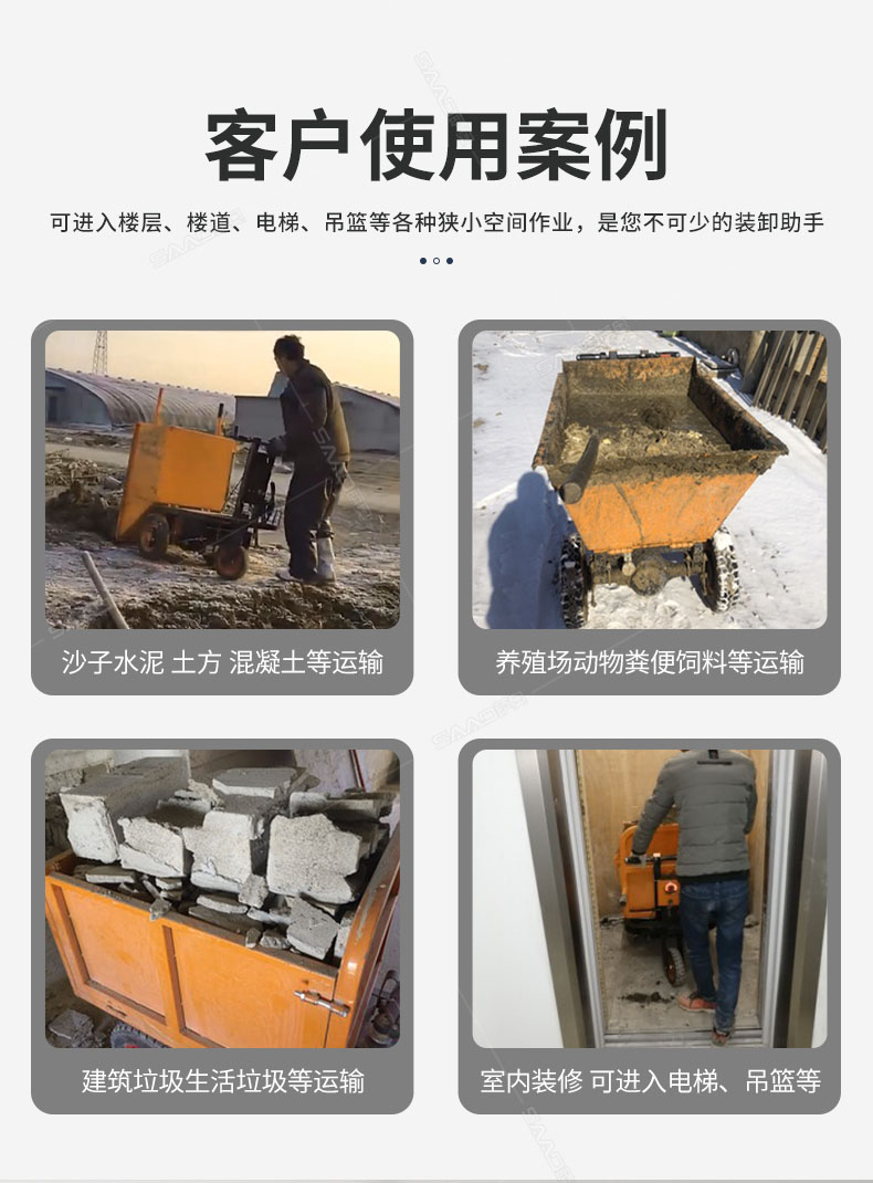 產品介紹: 此款車適用于建筑工地、室內裝修、養殖場、工廠等場所,運輸沙子、水泥、土方、混凝土、建筑垃圾生活垃圾、養殖場動物糞便、飼料等,體積小操作簡單靈活,可原地360度轉圈,可進入樓層、樓道、電梯、吊籃等各種狹小空間作業,是您必不可少的裝卸助手。