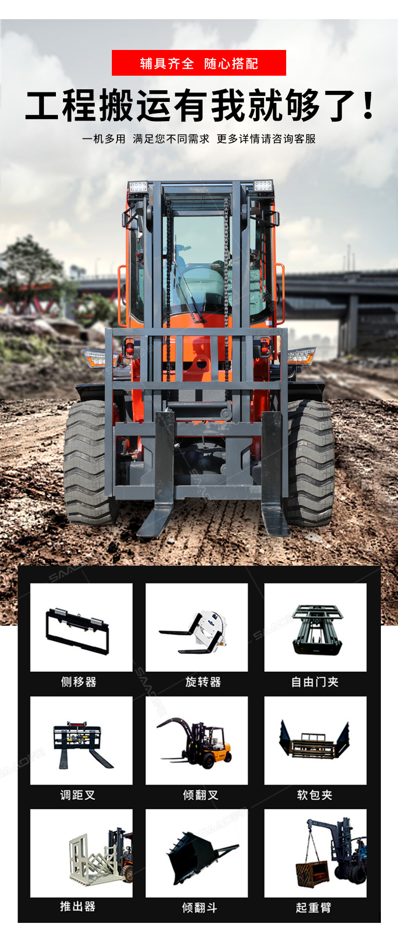 越野叉車可以在坡地和不平地面上進行貨物裝、卸、堆垛及搬運作業,具有良好的機動性、越野性可靠性。其功能多樣,可搭配側移器、調距叉、旋轉器、軟包夾、推出器、側翻叉、側翻斗、起重臂等工具完成不同的工作。