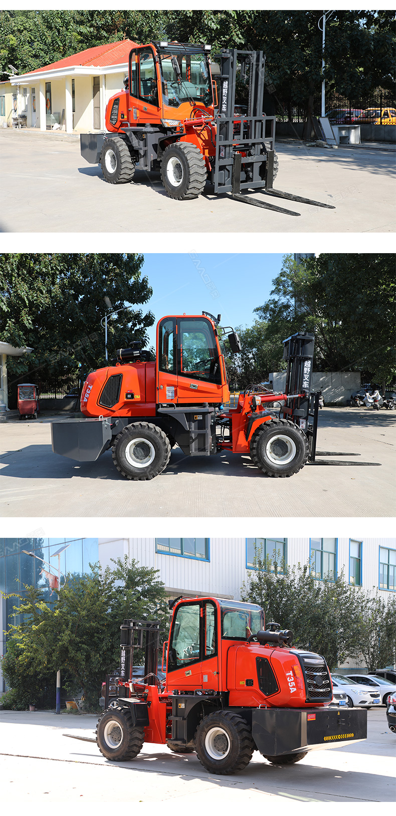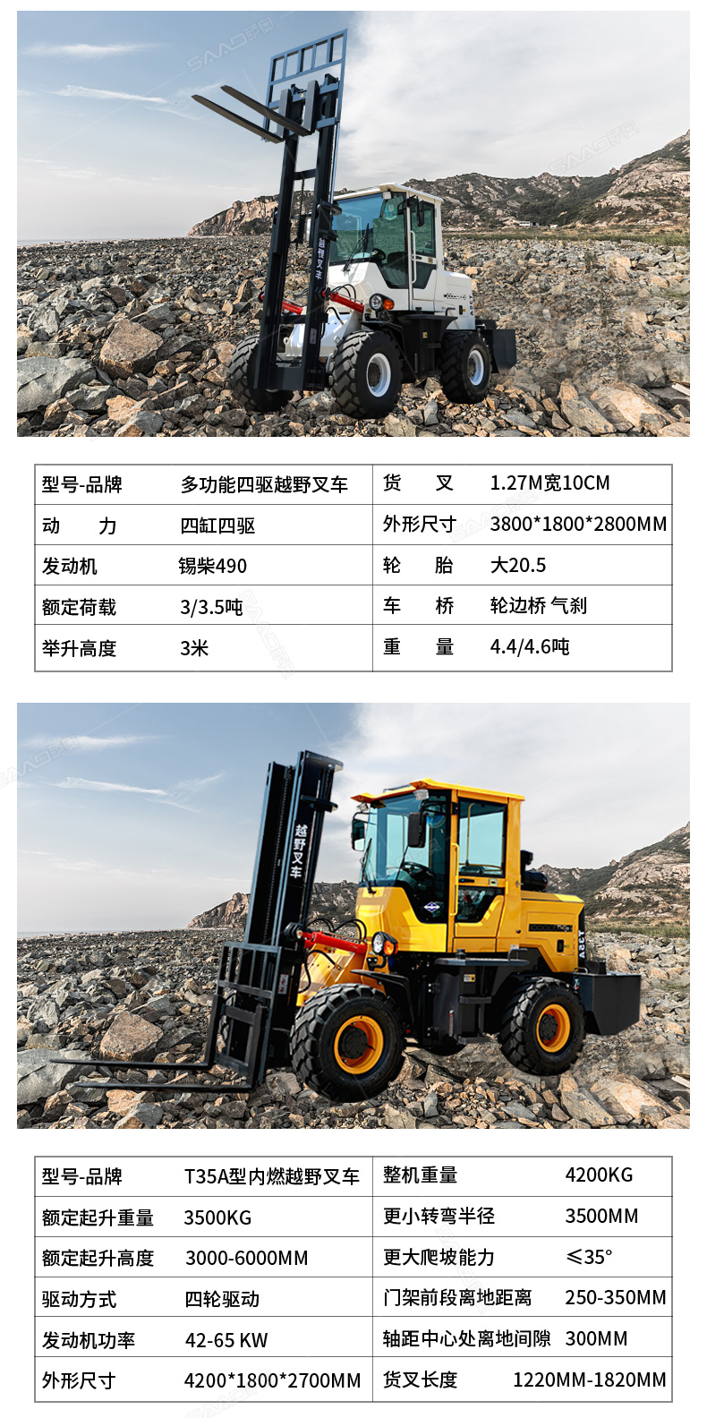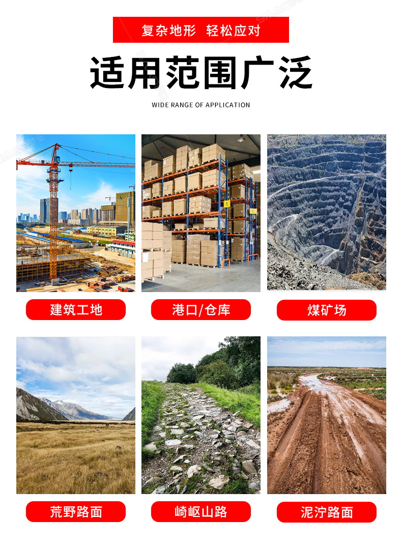 3.普通叉車只能在平整的路面上作業,而越野叉車既可以在普通路面上作業,還可以在山路泥路崎嶇道路作業,輪胎抓地力強,不打滑。