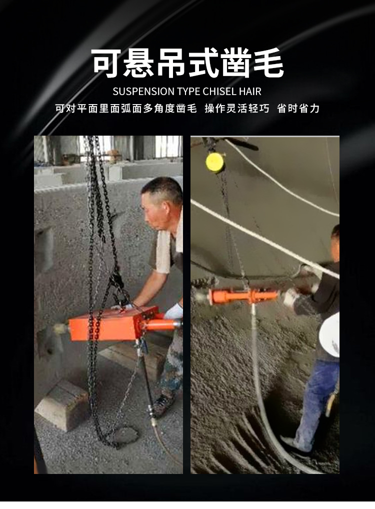 手持式懸掛鑿毛機(jī)機(jī)身有吊環(huán),鑿墻面的話吊起來(lái)使用,對(duì)平面、立面、弧形等多角度進(jìn)行鑿毛作業(yè),打擊力大、鑿深自如,應(yīng)用領(lǐng)域非常廣泛,又省力還方便。