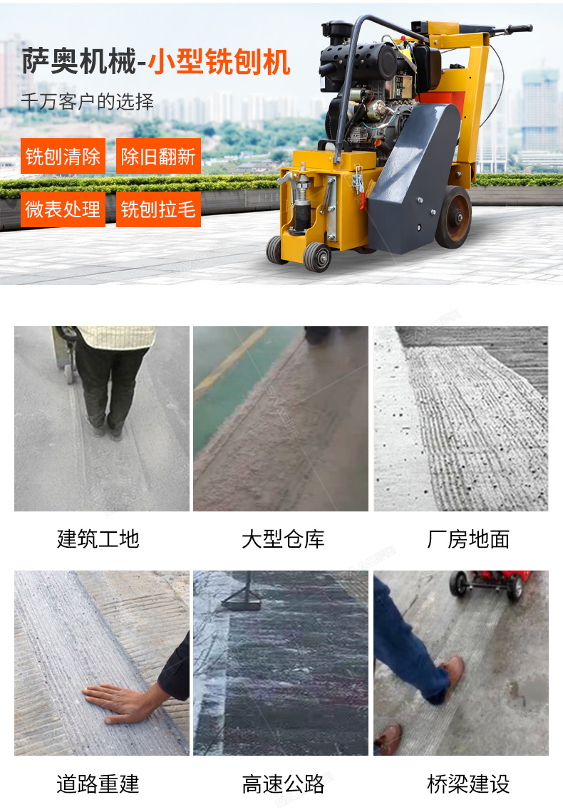 【產品介紹】 用于橋面鋪設瀝青或車間舊的混凝土地面重新攤鋪混凝土之前,清除水泥浮漿以及鏟平拉毛,也用于清除建筑施工中遺留的堅硬灰渣。 【產品用途】 小型銑刨機主要是用