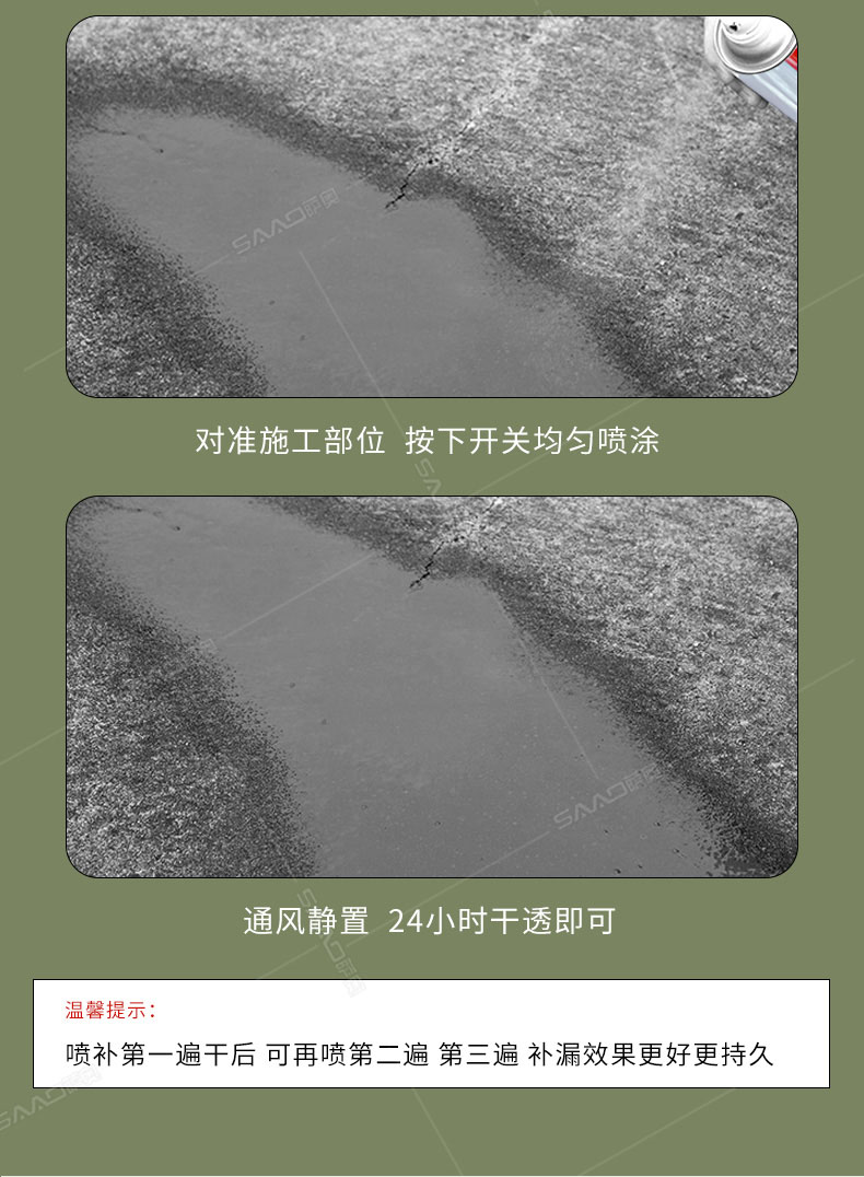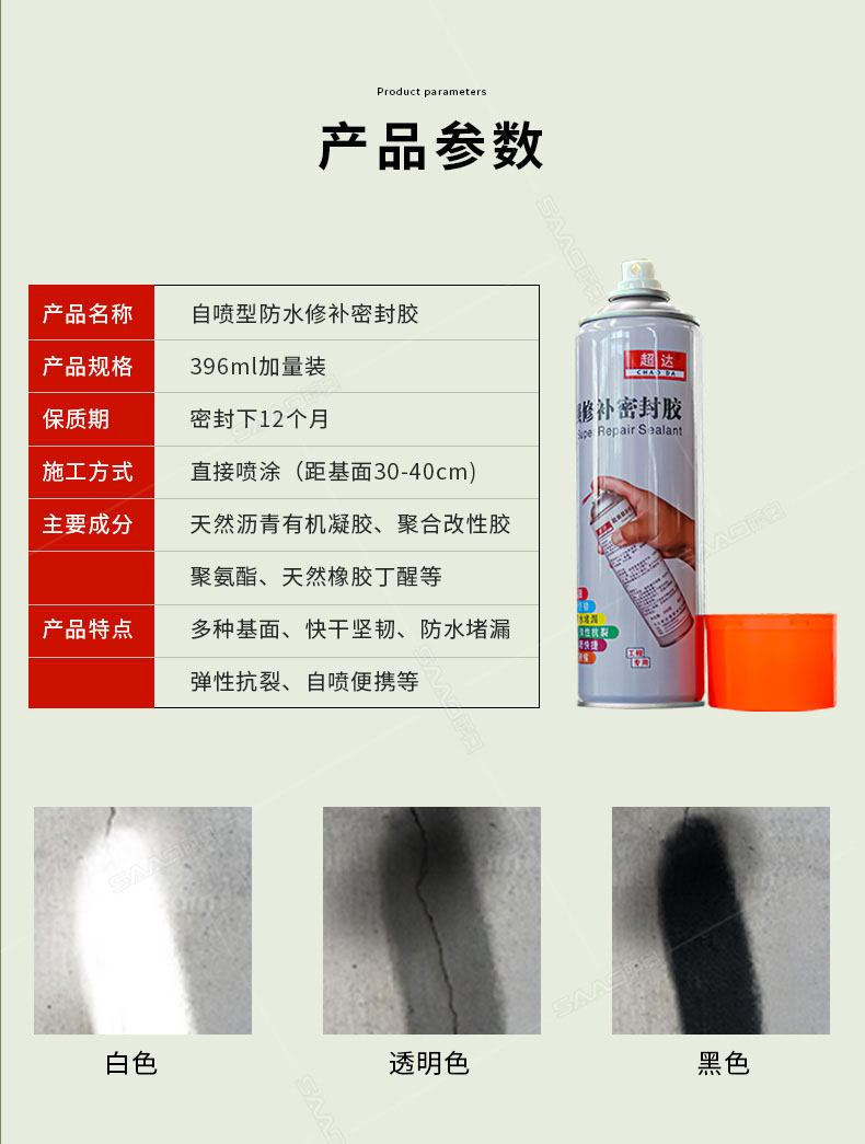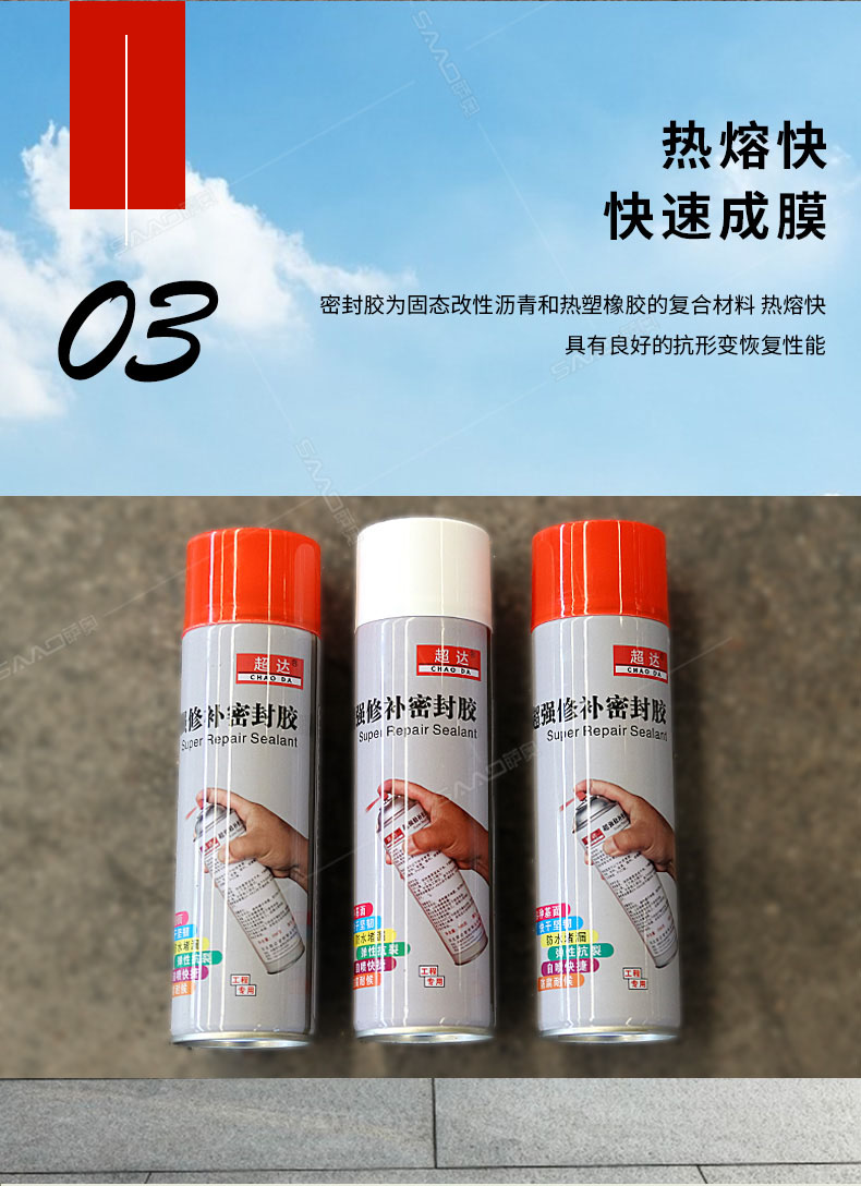 產品特性: 超強修補密封膠是專為防水施工中管根、管口、拐角和裂縫等處防水修復、薄弱易漏點而開發。直接噴涂、噴涂后形成強效橡膠密封保護膜,有效附著于各類表面與材質,直