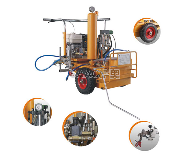 手推式冷噴劃線機為高壓力等流量型無氣噴涂機,該機利用汽油機驅動液壓系統帶動單柱塞泵,使涂料在機內形成高壓進行噴涂,所劃線厚薄均勻邊角齊