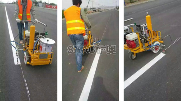 手推式冷噴劃線機為高壓力等流量型無氣噴涂機,該機利用汽油機驅動液壓系統帶動單柱塞泵,使涂料在機內形成高壓進行噴涂,所劃線厚薄均勻邊角齊,噴槍架導向桿升降設計,調節噴涂寬度準確方便,具有勞動強度低,施工快捷方便等特點。