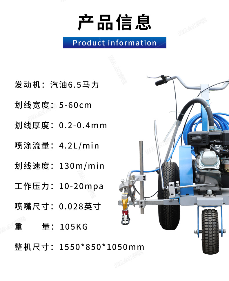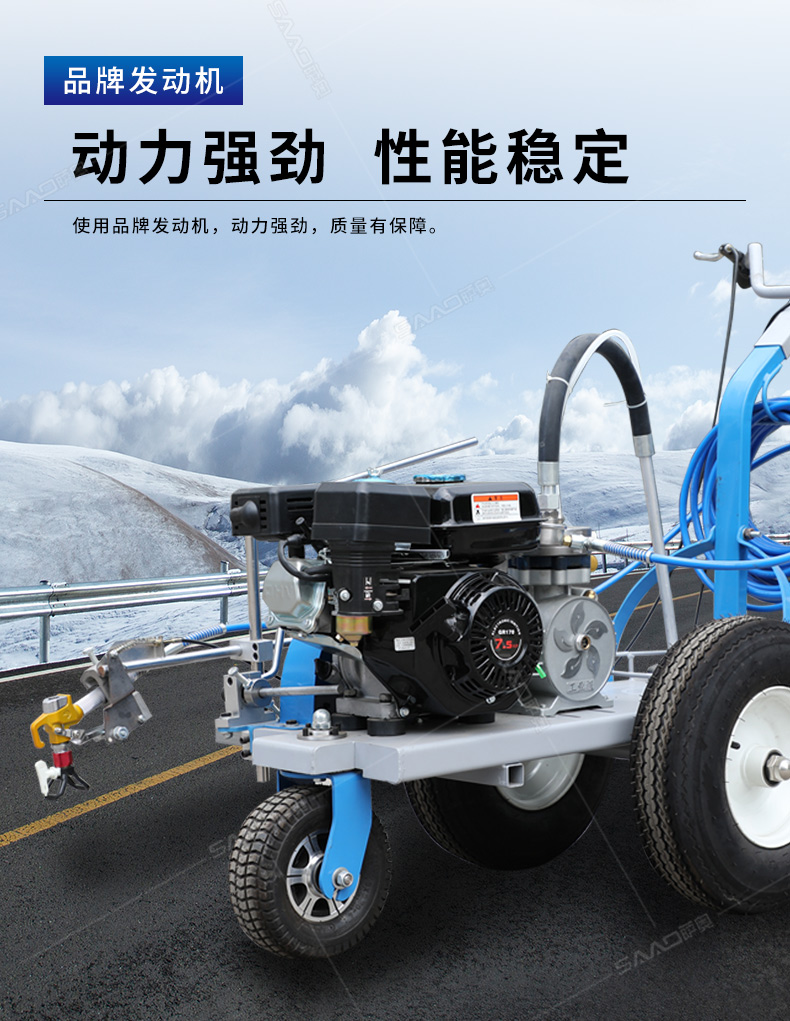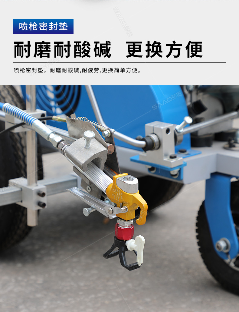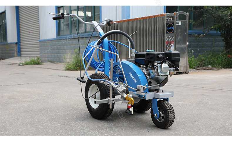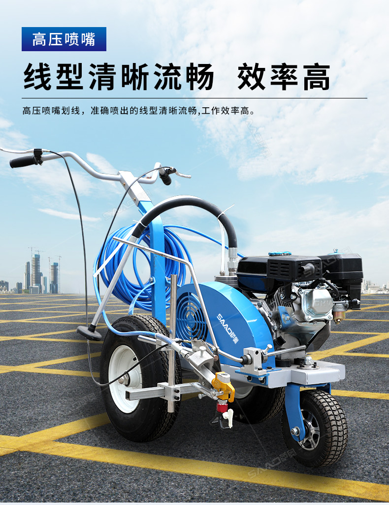 主要用于公路、市區、停車場、機場等涂劃直線、虛線、曲線、文字、箭頭等。具有劃線效果好、速度快、效率高、適用范圍廣、使用方便等優點。 【優勢特點】 1.高壓噴嘴劃線,準確
