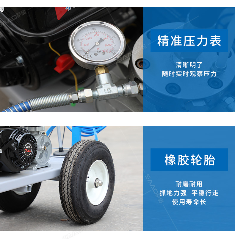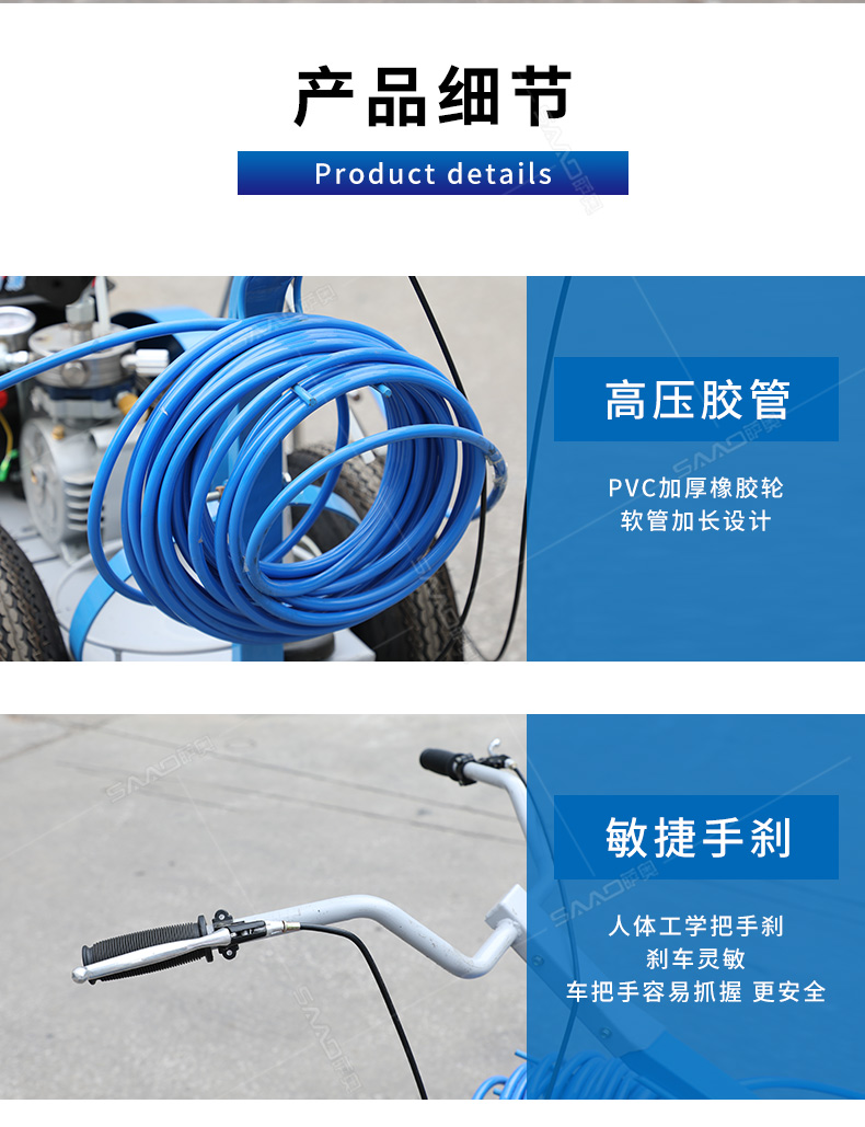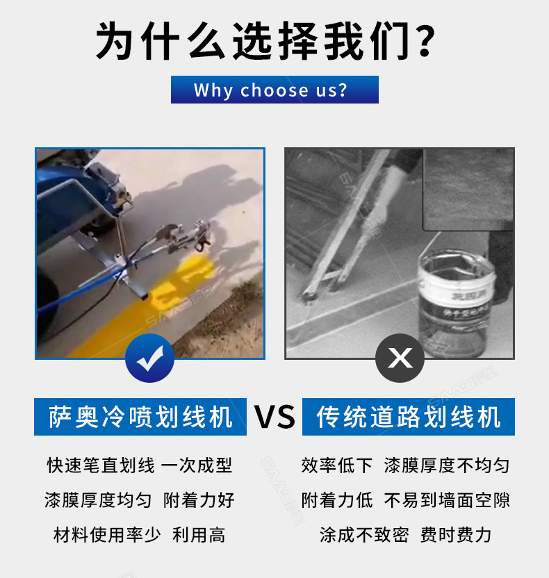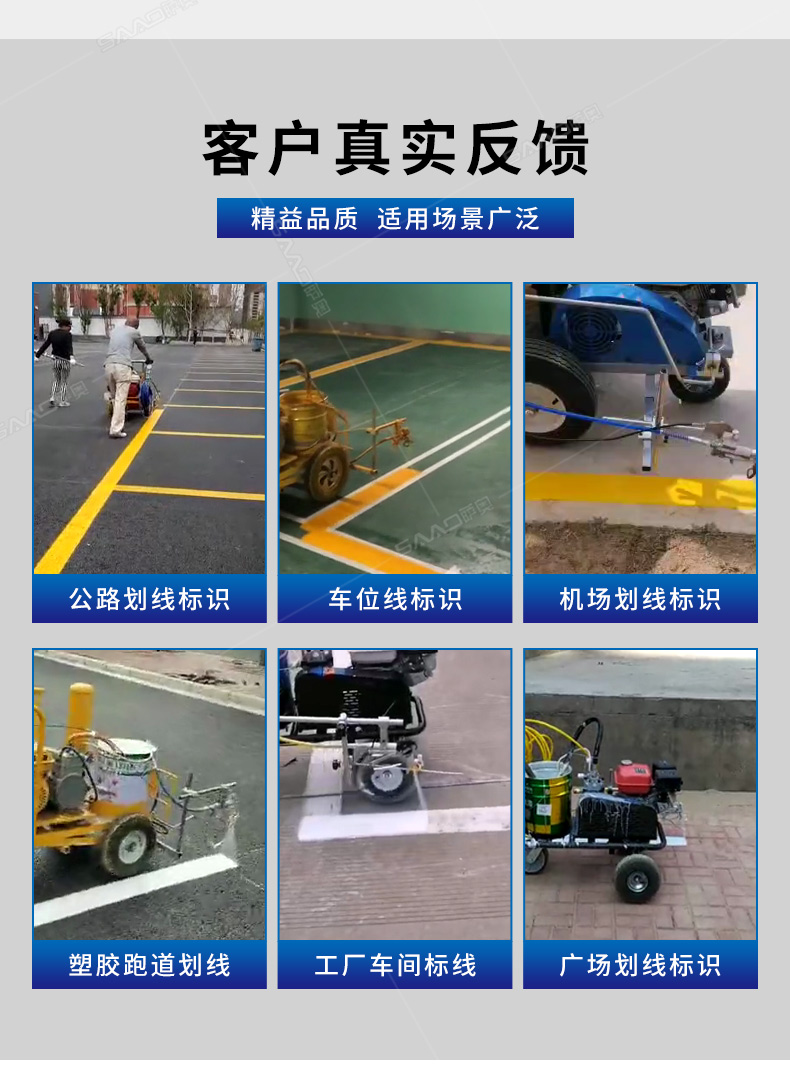主要用于公路、市區、停車場、機場等涂劃直線、虛線、曲線、文字、箭頭等。具有劃線效果好、速度快、效率高、適用范圍廣、使用方便等優點。 【優勢特點】 1.高壓噴嘴劃線,準確