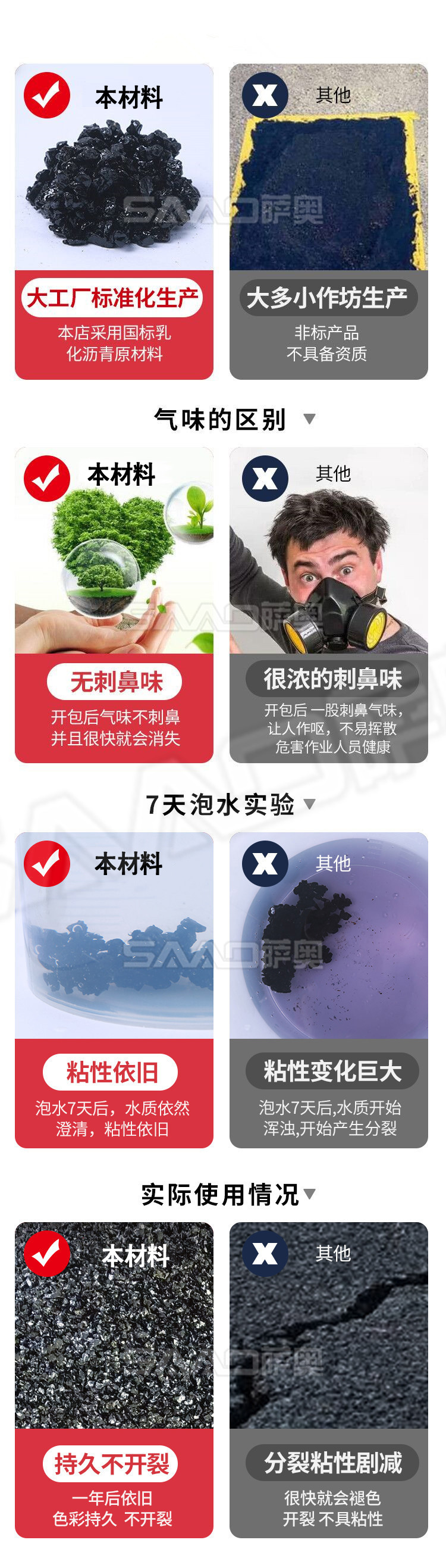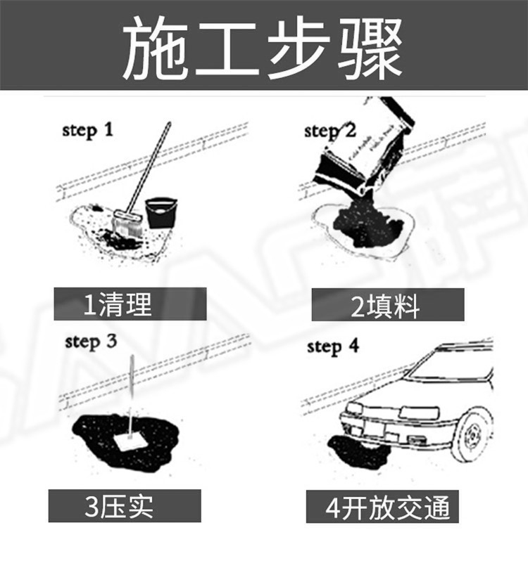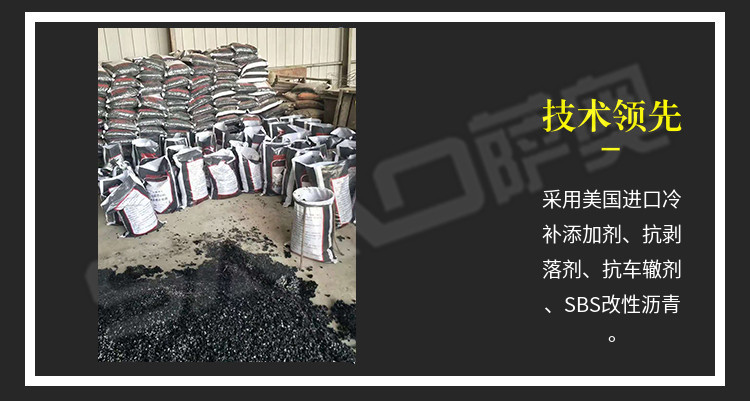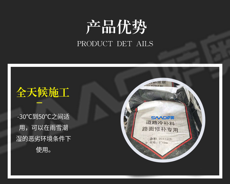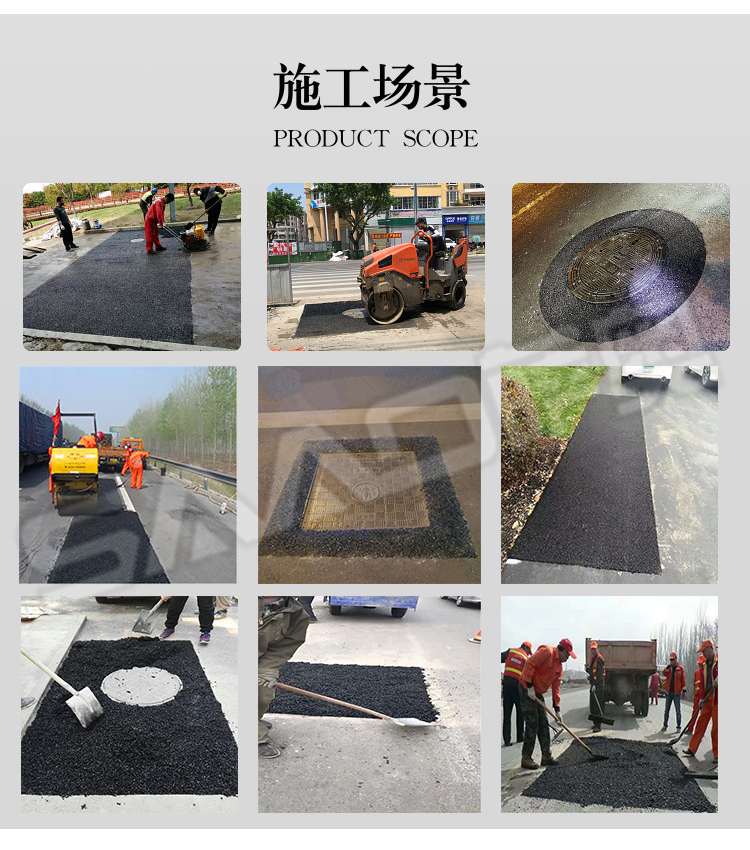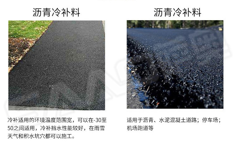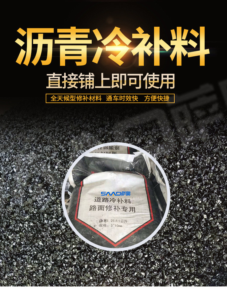 冷補(bǔ)料是采用特殊的方法改質(zhì)瀝青,使得瀝青具的粘結(jié)性,感壓性和粘彈性,在適當(dāng)壓實之后,能夠長久的粘在修補(bǔ)處不脫落。冷補(bǔ)料以其可以在全天候條件下修補(bǔ)路面,操作簡便,修補(bǔ)質(zhì)量好,存放長久,節(jié)省費用等諸多優(yōu)點,已被廣泛的應(yīng)用于各省市道路路面修補(bǔ)且日益受到道路養(yǎng)護(hù)部門的認(rèn)可和歡迎。冷補(bǔ)適用的環(huán)境溫度范圍寬,可以在-30至50之間適用,在雨雪天氣和積水坑穴都可以施工。