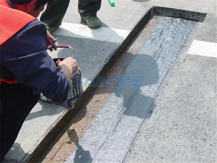 該產(chǎn)品首先可以滿足防水層的厚度,達到良好的防水效果;上薄下厚的結(jié)構(gòu)有效地保證了與基層、面層的粘結(jié)強度,當防護膜與高聚物的熔點低于瀝青混合料溫度時,高強胎基上層的熱熔狀高聚物能很好地起到承上啟下的粘結(jié)作用。置于面層與水溫基層之間,能增強面層與基層間的結(jié)合力,達到了較理想的層間粘結(jié)作用。當路面發(fā)生溫縮時,瀝青面層不僅要承受本身收縮變形的拉應力,而且水溫層的收縮變形會在面層底部引起較大的拉應力,設置粘結(jié)膜 后,水溫基層對面層的附加應力減小,面層底部所受拉應力下降而不導致造成拉裂。有較大延伸性的抗裂防水粘結(jié)膜作為層間層,可以有效地緩解裂縫處的應力集中,即彈性層間層起到了吸收部分拉伸能量的作用,并承擔部分水平應力。