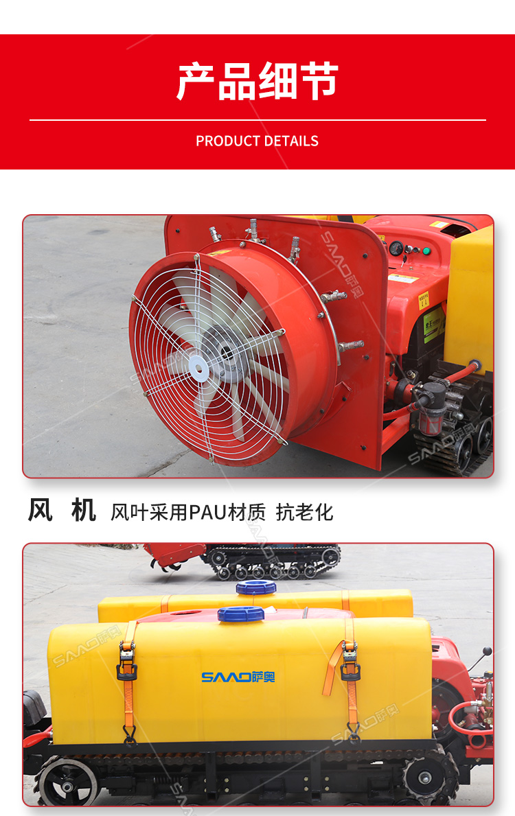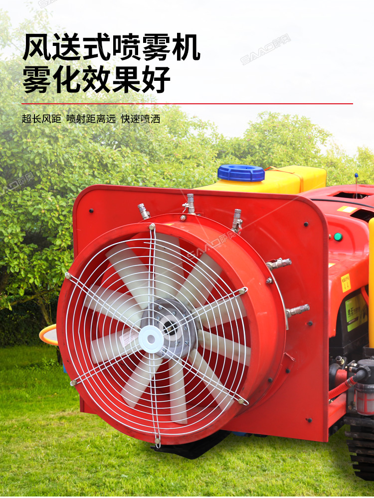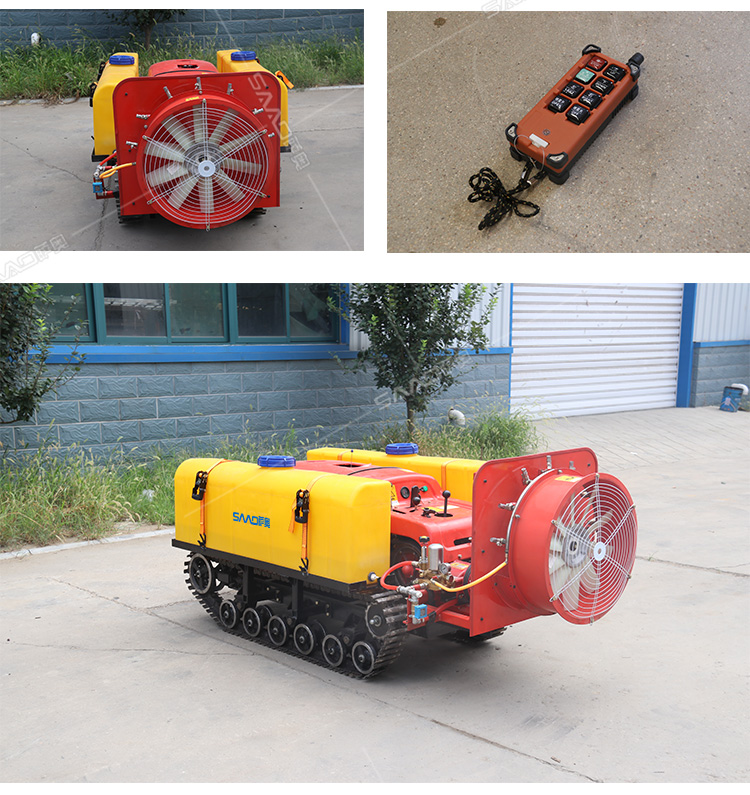 28馬力鋼履帶自行式打藥機,風送式噴霧機,霧化好,噴射距離遠;遙控操作,人機分離,確保作業人員安全,免受藥霧傷害。