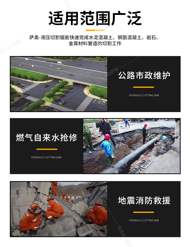 SA13液壓切割鋸在公路市政維護(hù)、燃?xì)庾詠硭畵屝?、地震消防救援中能快速完成水泥混凝土、鋼筋混凝土、巖石、金屬材料管道的切割工作。整體輕巧,易于操作,動力強(qiáng)勁而且耐用???/div>