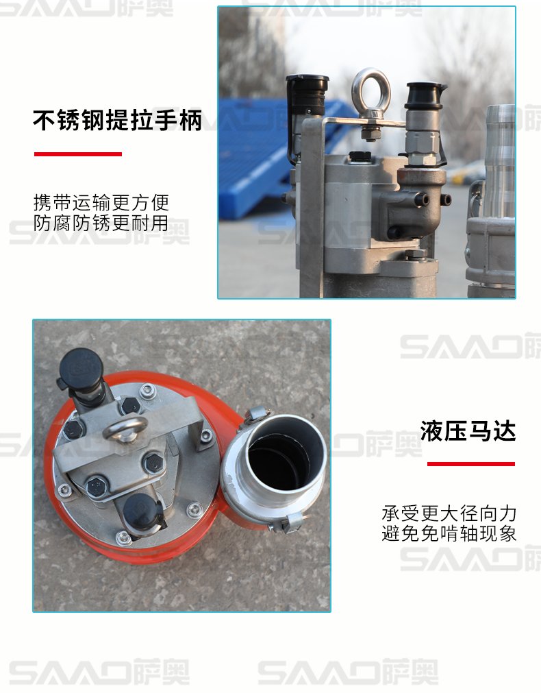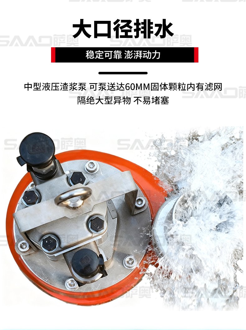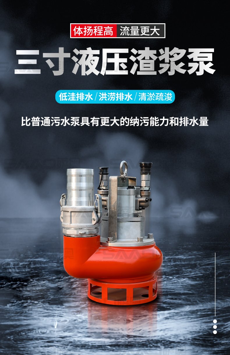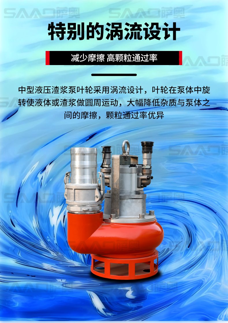 液壓渣漿泵重量輕、緊湊和效率高,比普通的污水泵具有更大的納污能力和更大的排水量,適宣于砂漿、泥漿類固體含量高的泵送工作,它在公路、市政、搶險救援、城市管網排水、燃